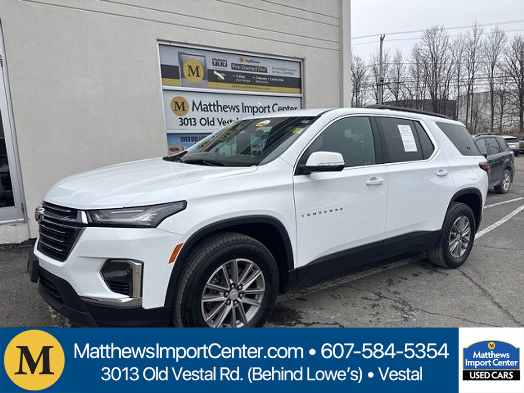 Matthews Import Center promises each customer a thorough and confident 120-point inspection on our used inventory guaranteeing a relaxing and peace-of-mind experience. We are located behind Lowes in Vestal NY. Or call us at (607) 729 - 6261Matthews Import Center3013 Old Vestal RoadVestal NY 13850. Summit White 2024 Chevrolet LT Leather Traverse Limited AWD 9-Speed Automatic 3.6L V6 SIDI VVT